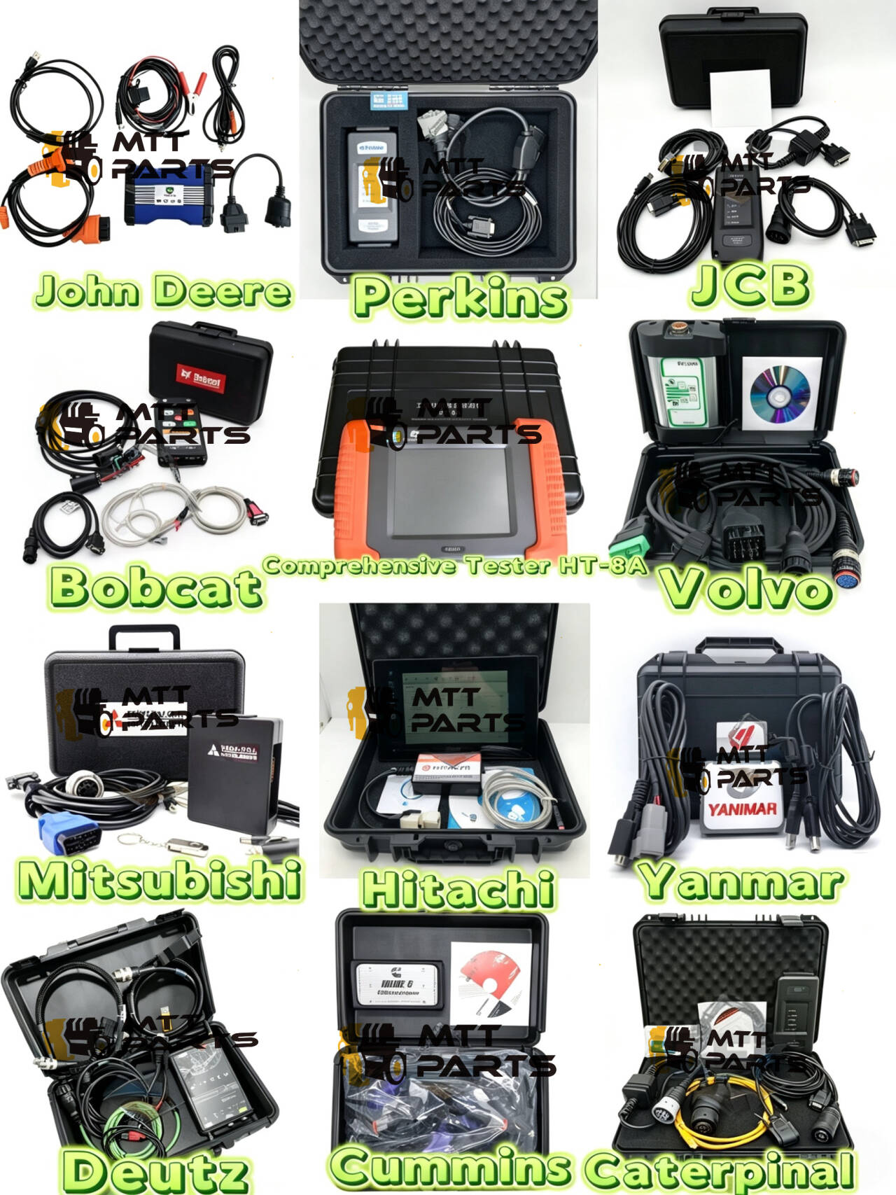 Что бросается в глаза, так это то, насколько практично они выглядят. Никаких универсальных инструментов, которые могли бы работать наполовину; это настройки для конкретных брендов, которые правильно подключаются и предоставляют вам действительно необходимые данные. В центре показан даже комплексный тестер «все в одном» (HT-8A), а также варианты для брендов, для которых немного сложнее найти хорошую диагностику, таких как Yanmar или Bobcat.